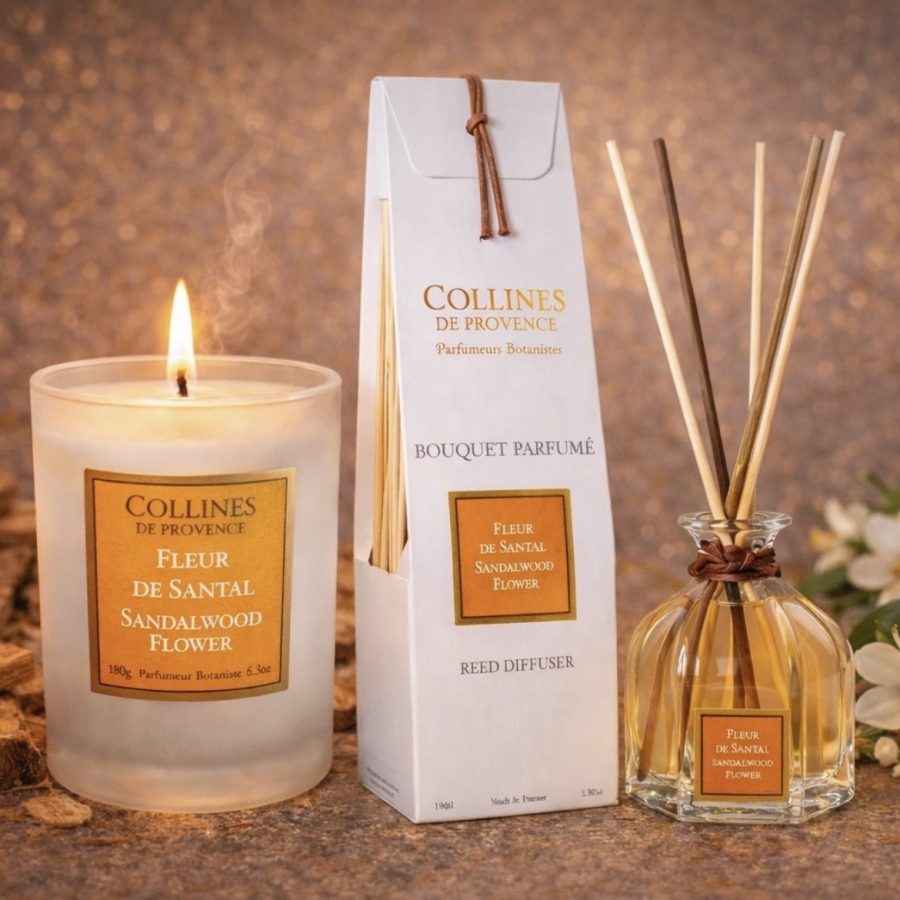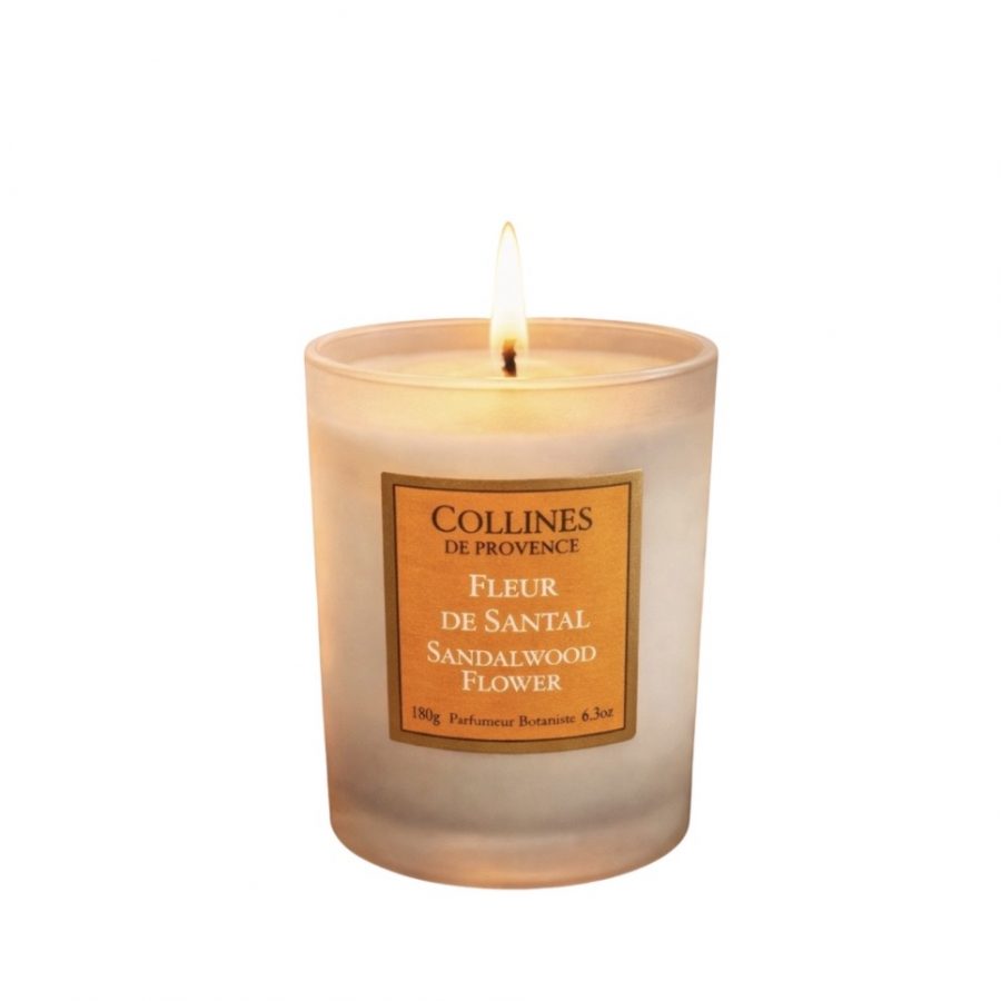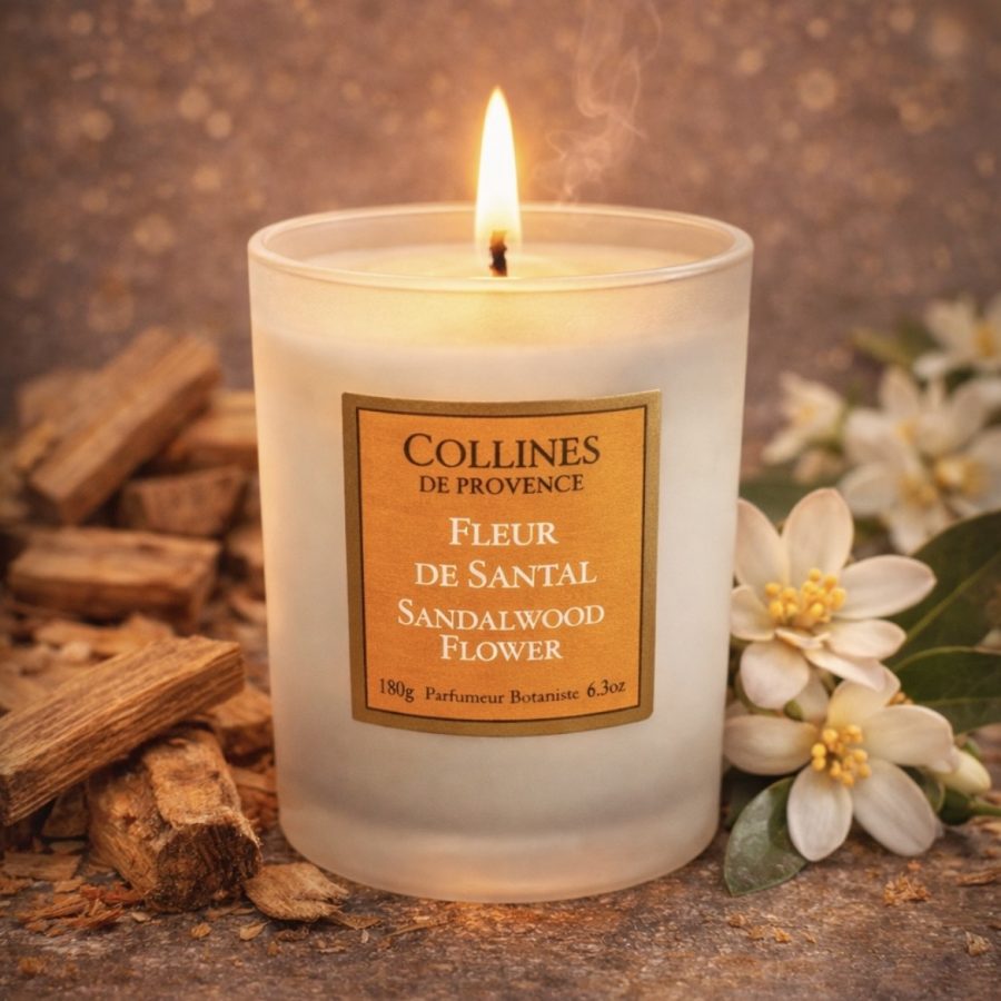 Bougie parfumée Fleur de Santal Collines de Provence : notes boisées et florales, ambiance chaleureuse, fabrication française en Haute-Provence.