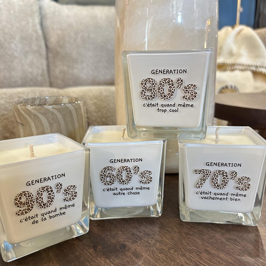 Bougies “Tout est dit” : un hommage lumineux et nostalgique aux générations 60’s, 70’s, 80’s et 90’s. Quatre époques, une flamme.