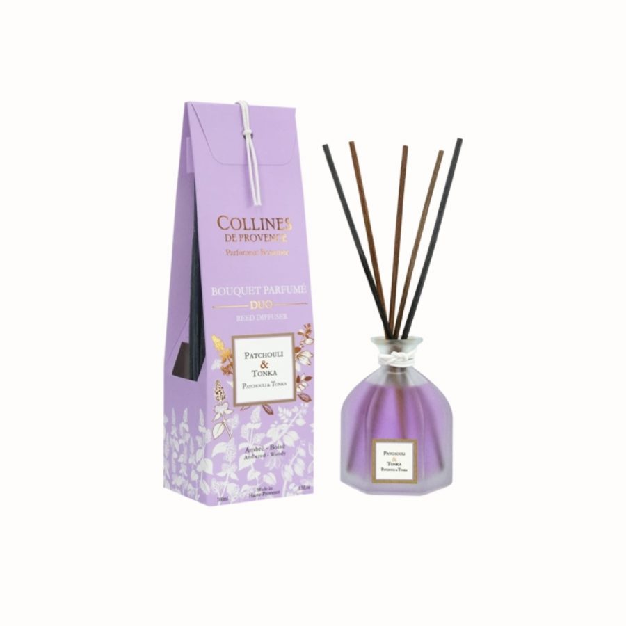 Bouquet parfumé Patchouli & Tonka, notes boisées et vanillées pour une diffusion élégante et une ambiance chaleureuse.