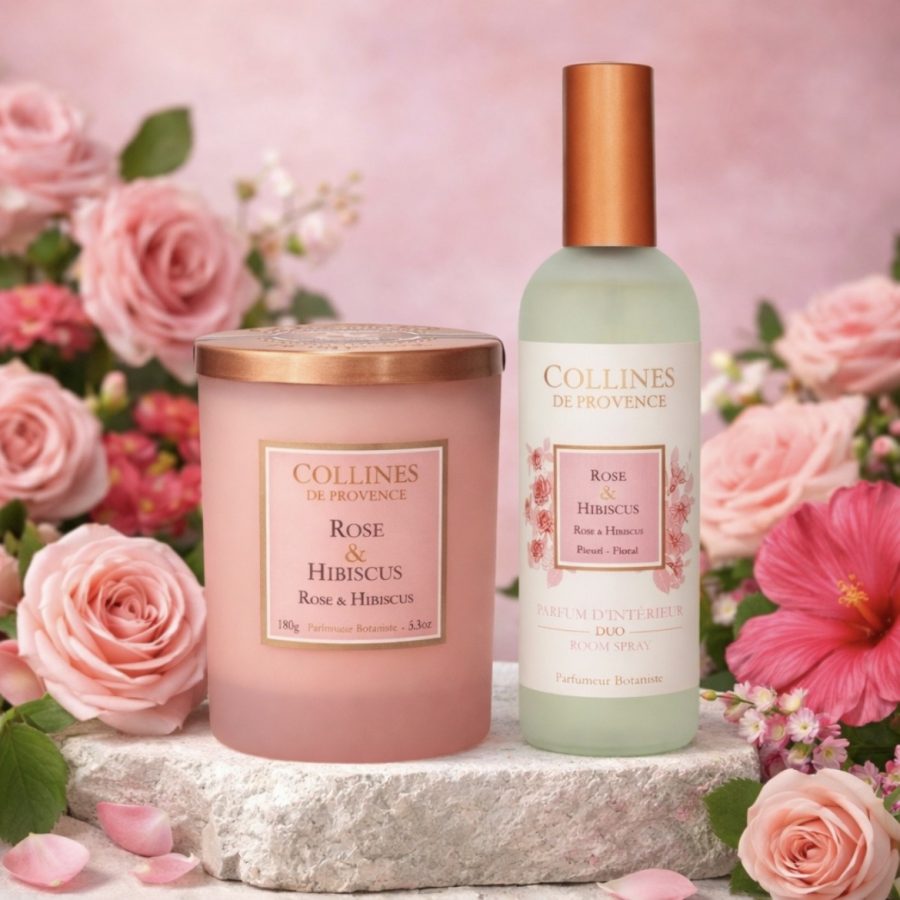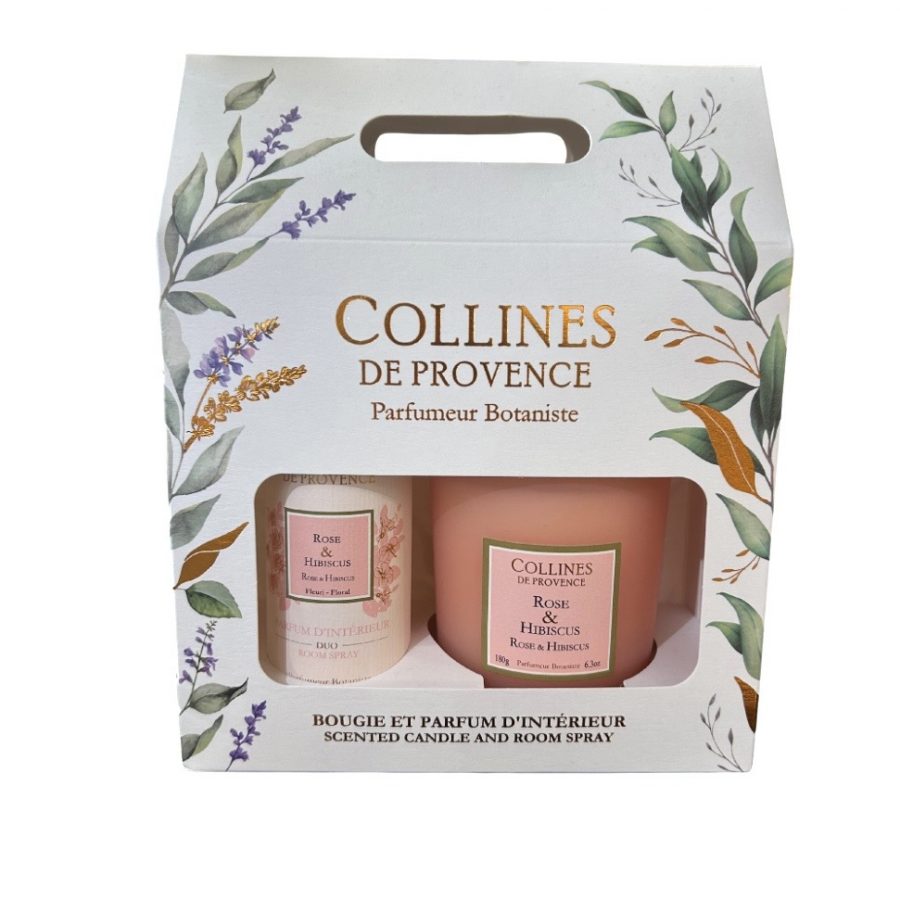 Coffret bougie parfumé Rose & Hibiscus avec bougie et parfum d’intérieur. Notes florales délicates et élégantes pour une ambiance douce et raffinée