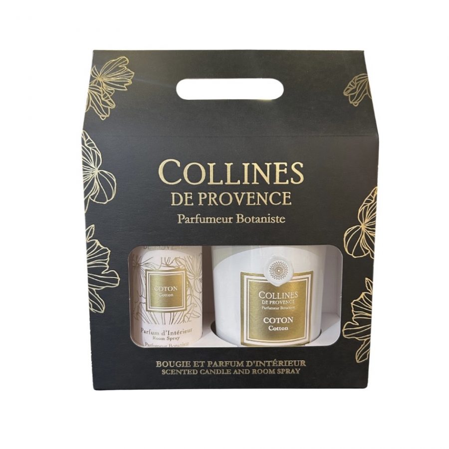 Présenté dans un écrin noir chic sublimé par de délicates dorures ✨, ce coffret incarne le savoir-faire artisanal provençal. Il réunit deux indispensables de l’ambiance parfumée : une bougie parfumée et un parfum d’intérieur, parfaitement assortis autour de la senteur emblématique Coton. Cette fragrance subtile, à la fois florale et poudrée 🌸, évoque la pureté, la tendresse et une sensation de bien-être immédiat.