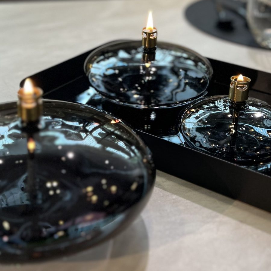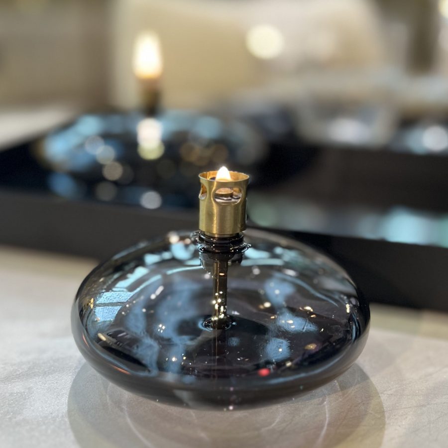 Lampe à huile galet « smoked » en verre soufflé fumé. Objet déco élégant créant une ambiance cocooning, lumière tamisée et chaleur dans votre intérieur.