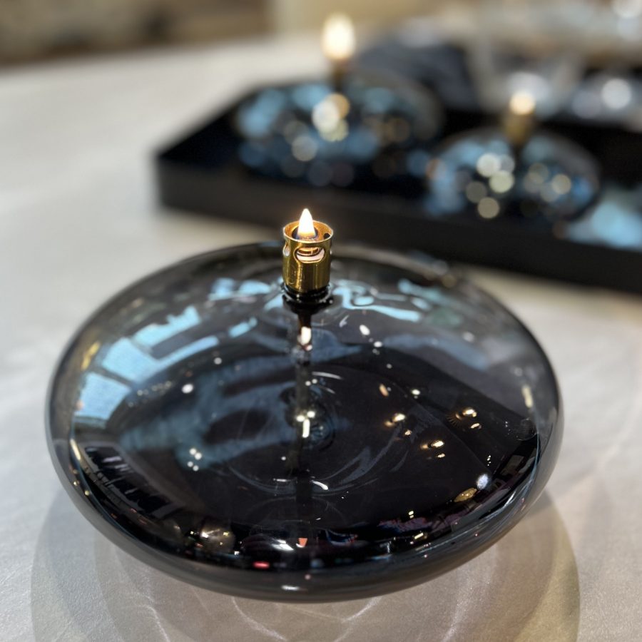 Le brûleur en métal doré ou finition laiton souligne le caractère élégant de la lampe. Il accueille une mèche en fibre de verre reconnue pour sa durabilité, sa combustion propre et son entretien facile. En utilisant une huile de paraffine liquide transparente, sans odeur ni résidu, la flamme reste stable, claire et sans fumée, offrant une expérience lumineuse aussi esthétique que fonctionnelle.