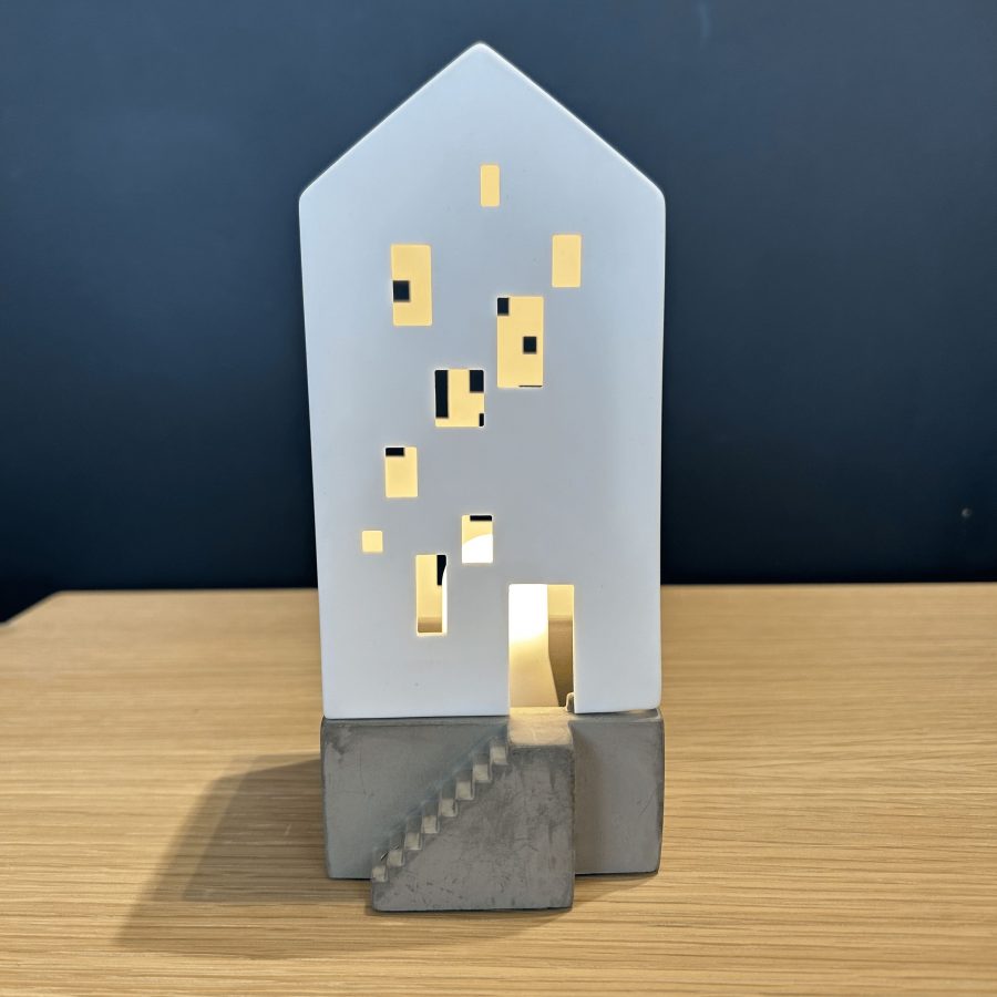 Maison lumineuse « Petit immeuble d’appartements » en porcelaine avec socle béton. Un objet déco design qui diffuse lumière, chaleur et ambiance poétique.