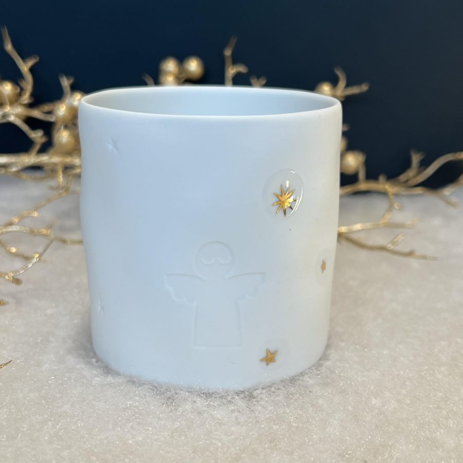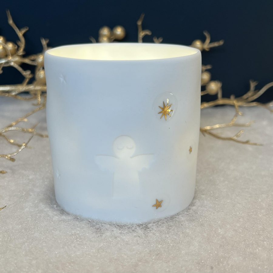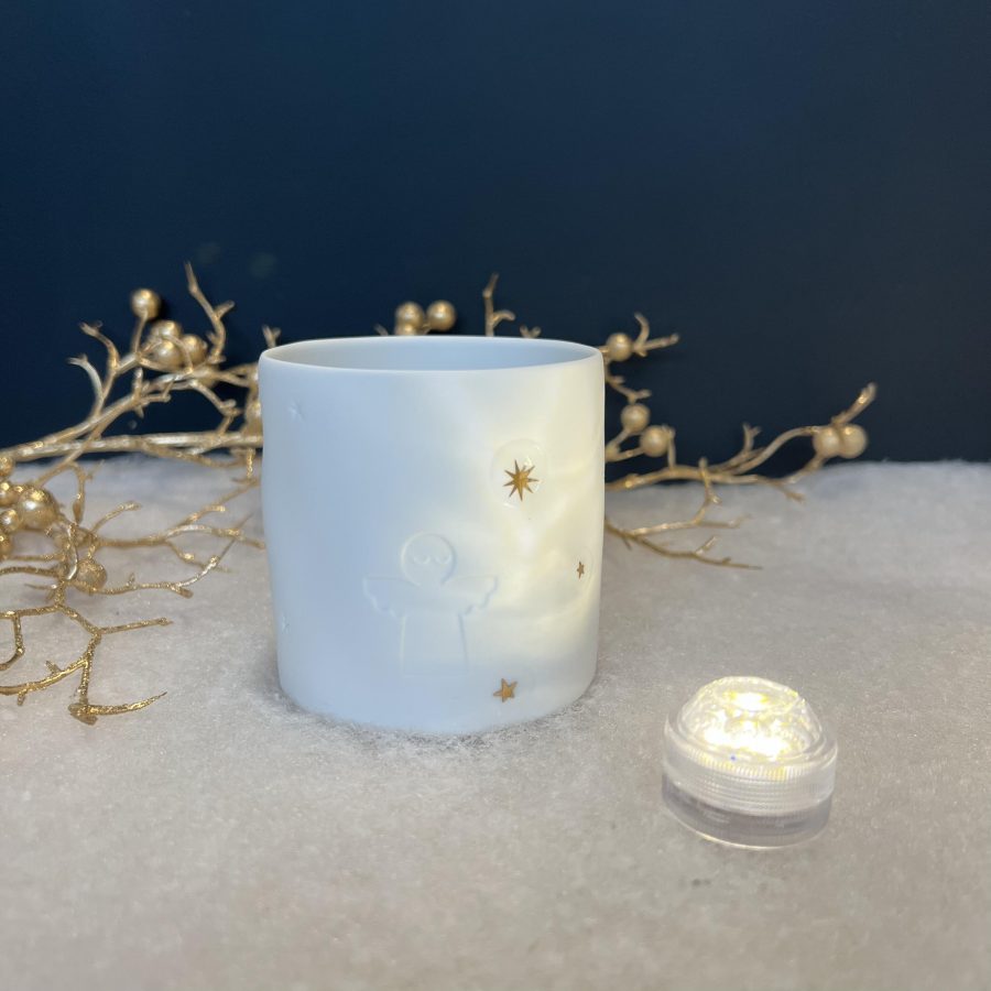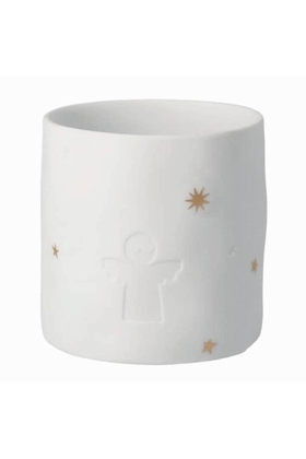 Photophore Ange Räder en porcelaine avec reliefs dorés, élégant et poétique, diffuse une lumière douce et chaleureuse pour une déco hivernale.