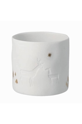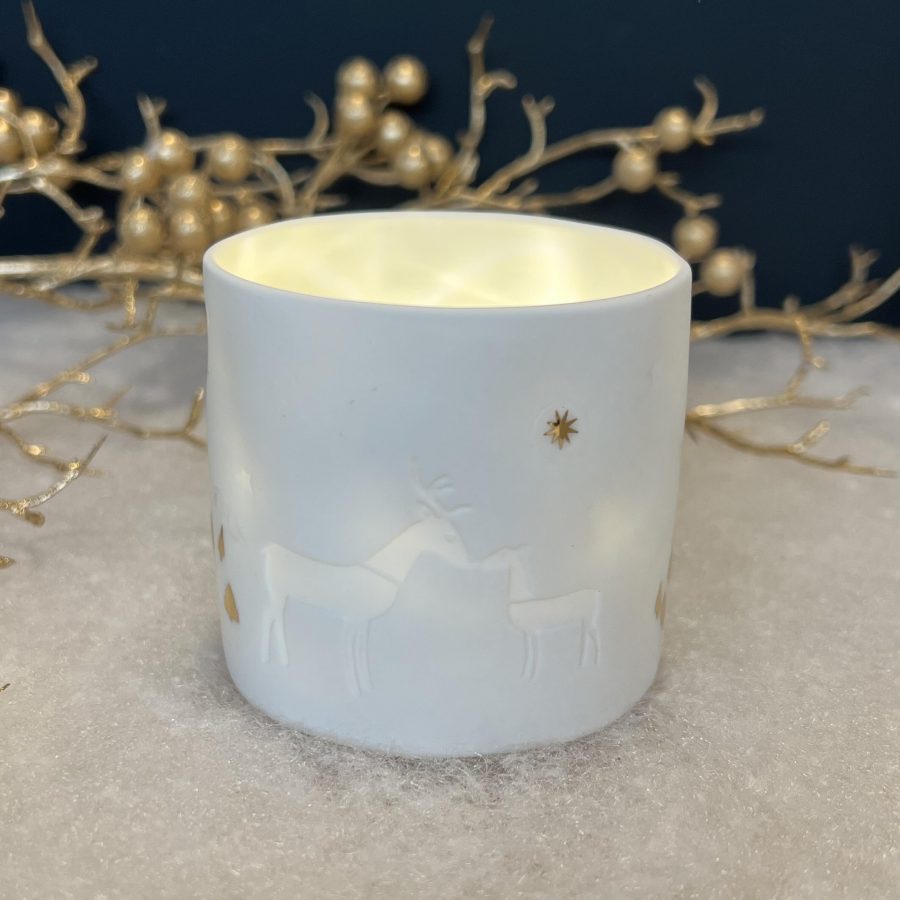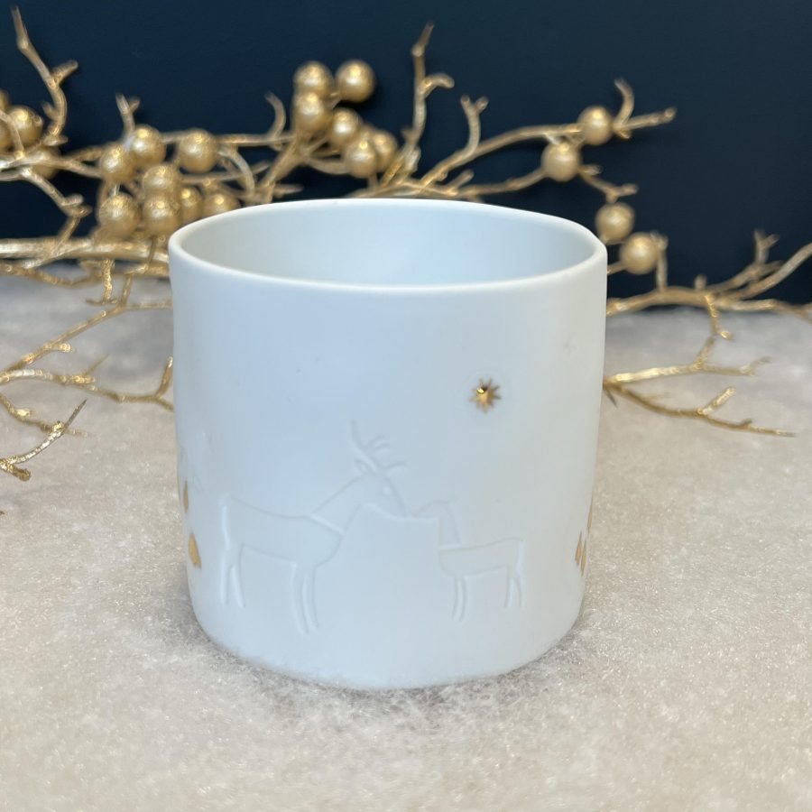 Photophore Cerfs Räder en porcelaine avec reliefs dorés, élégant et poétique, diffuse une lumière douce et chaleureuse pour une déco hivernale.